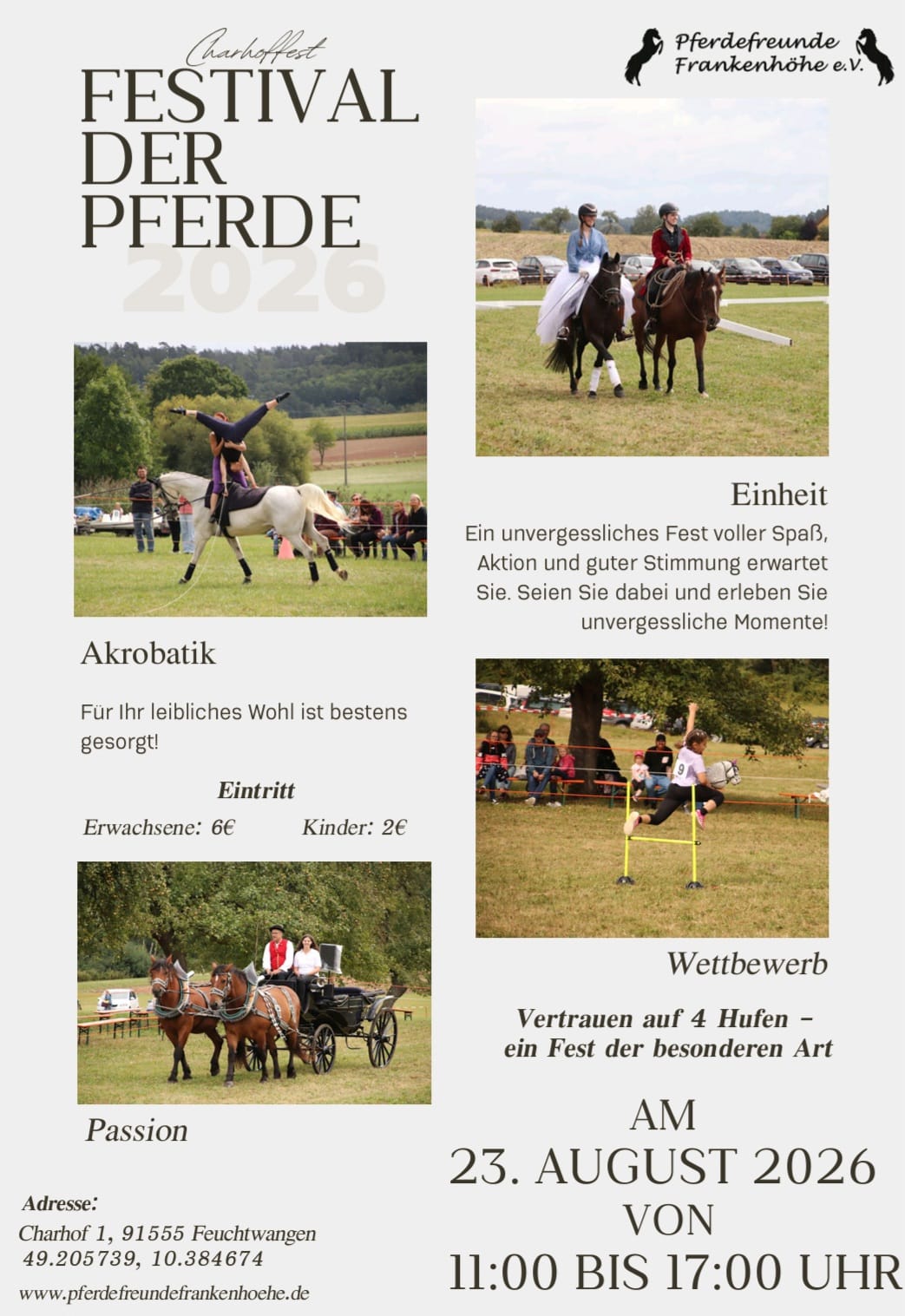 Charhof-Fest am 23. August 2026 Autor PressesprecherVeröffentlicht am 25. Januar 2026 Unter dem Motto "Vertrauen auf 4 Hufen - ein Fest der besonderen Art" findet am Sonntag, den 23. August 2026 unser Charhoffest auf dem wunderschönen idyllischen Charhofgelände statt.